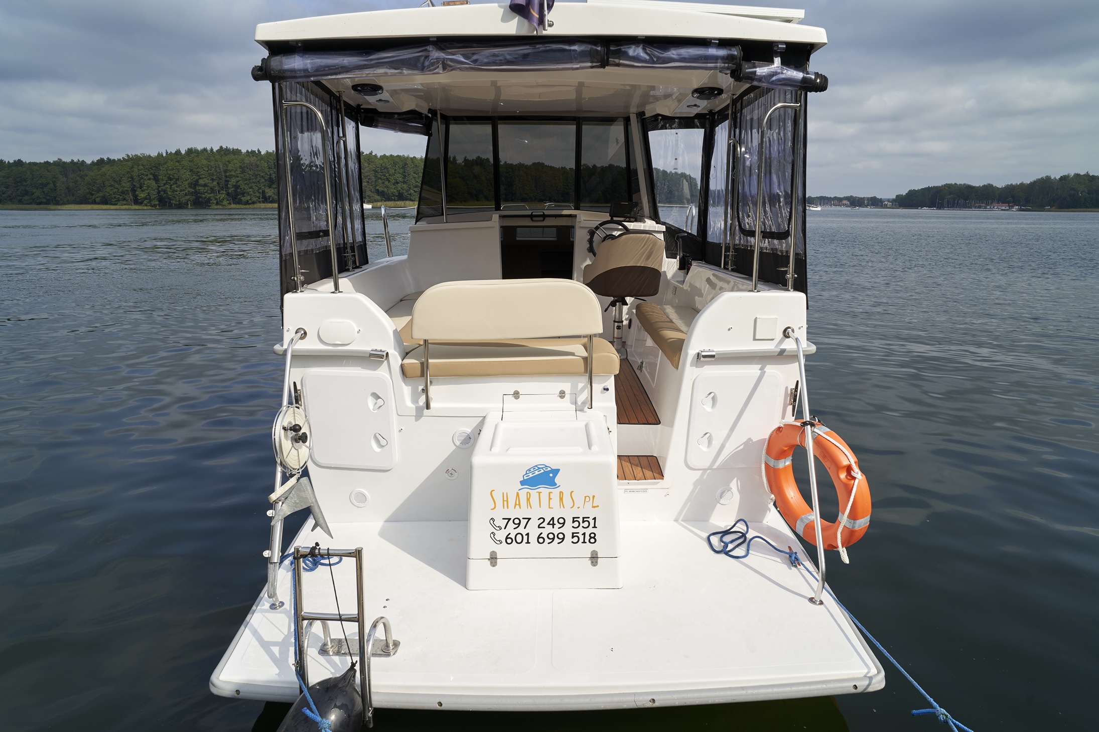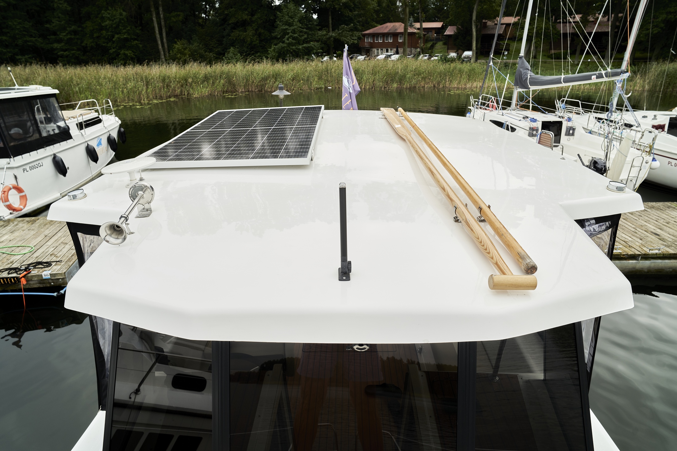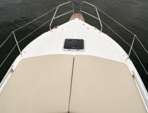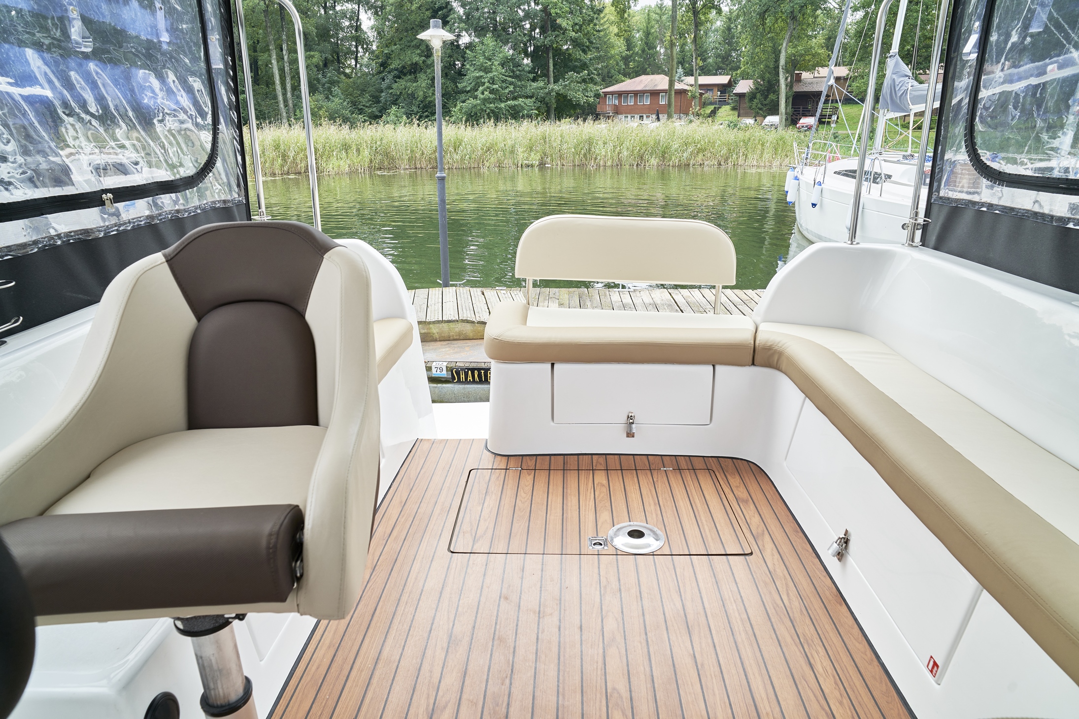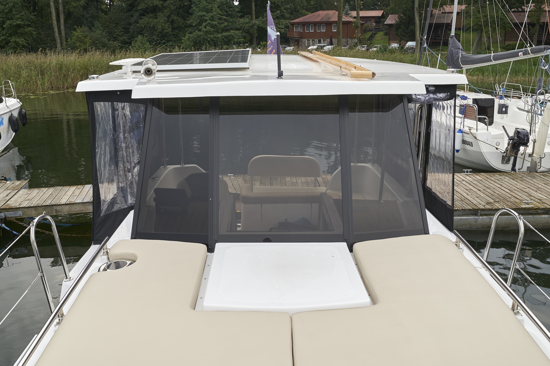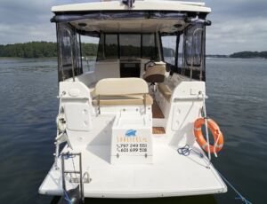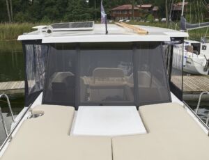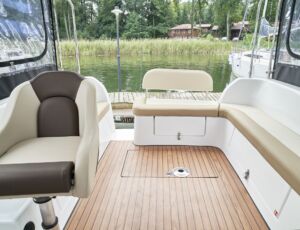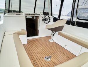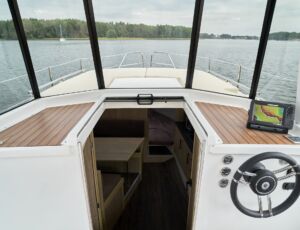 Posiada stałe zadaszenie nad obszernym oświetlonym kokpitem wyposażonym w stolik, nagłośnienie i wygodne siedziska z materacami. Od wiatru i deszczu ochronią Państwa rolety umożliwiające komfortowe pływanie nawet podczas deszczowych dni. W słoneczne dni skorzystać mogą Państwo z obszernego pokładu słonecznego wyposażonego w wygodne materace.
