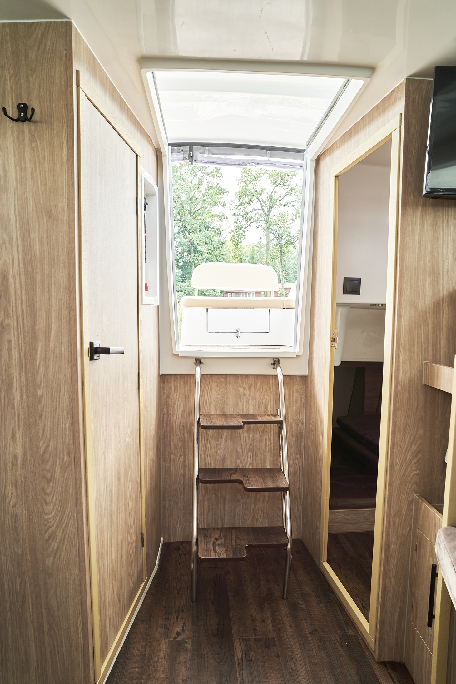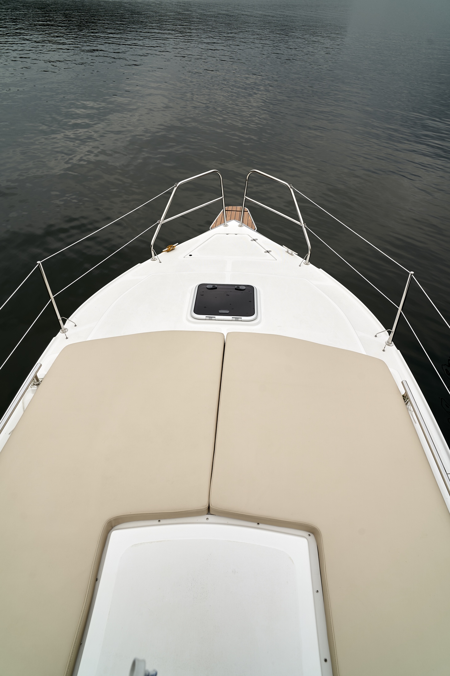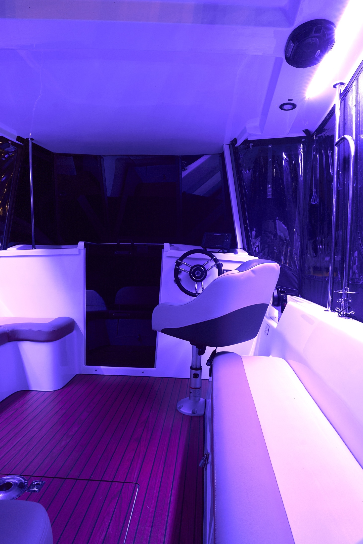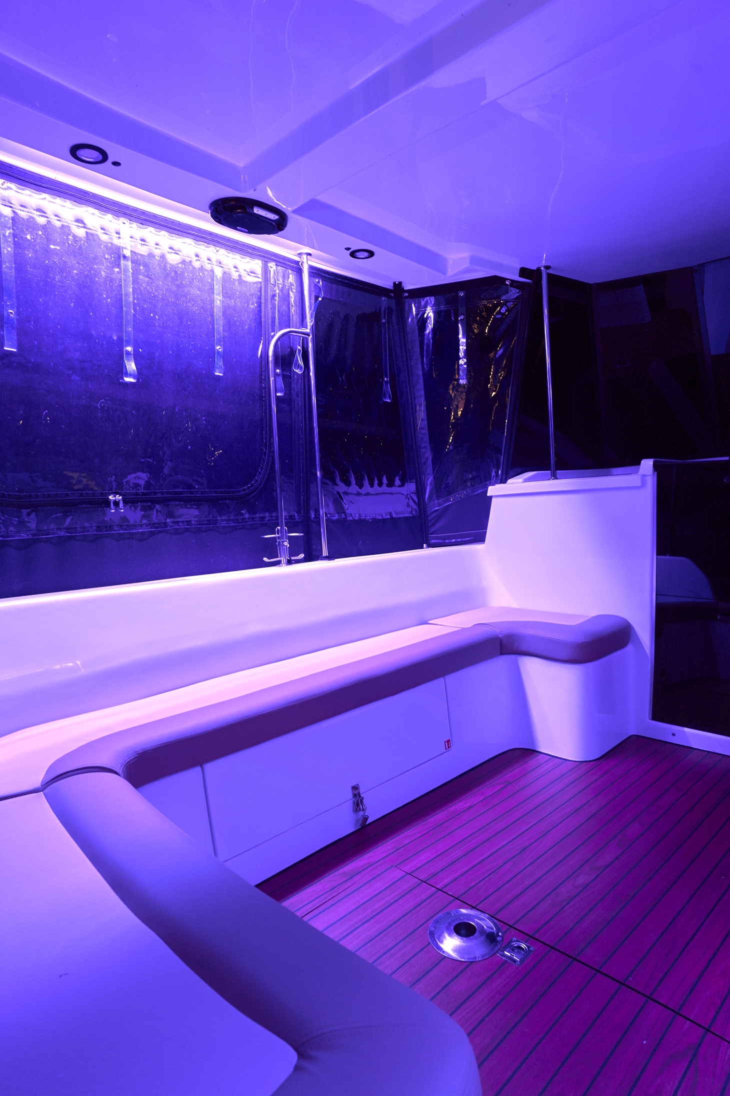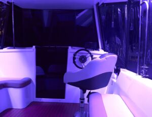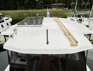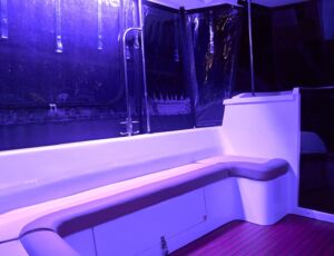 Posiada stałe zadaszenie nad obszernym oświetlonym kokpitem wyposażonym w stolik, nagłośnienie i wygodne siedziska z materacami. Od wiatru i deszczu ochronią Państwa rolety umożliwiające komfortowe pływanie nawet podczas deszczowych dni. W słoneczne dni skorzystać mogą Państwo z obszernego pokładu słonecznego wyposażonego w wygodne materace.