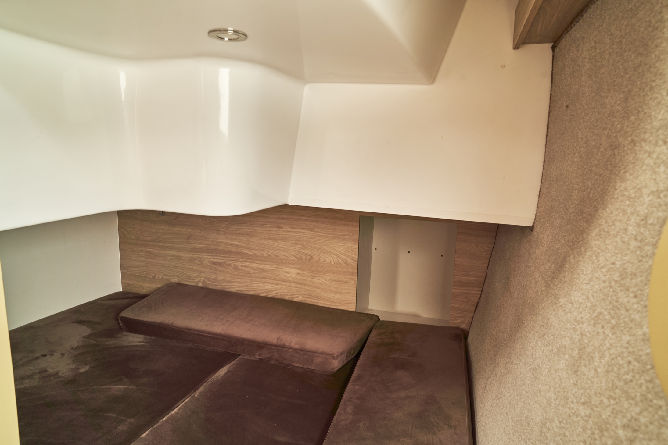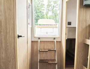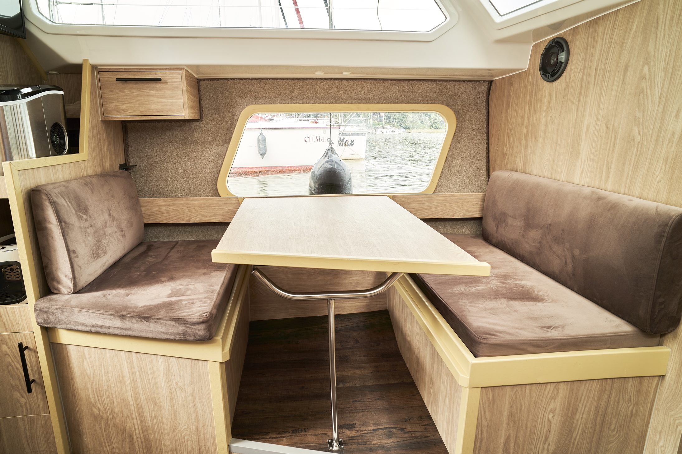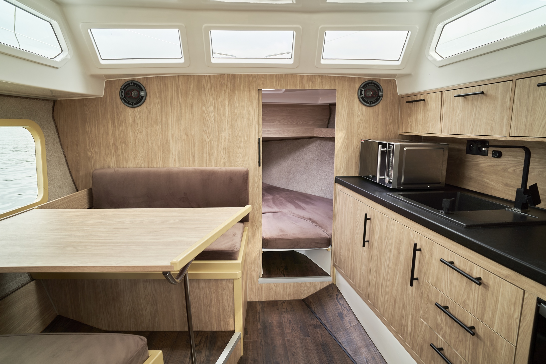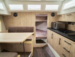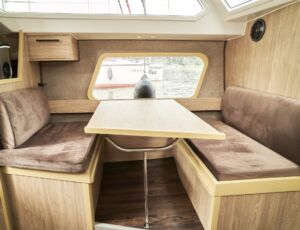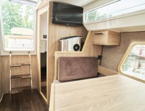Łatwe i bezpieczne wchodzenie i wychodzenie z jachtu zarówno dla dzieci jak i dorosłych gwarantuje bardzo duża platforma rufowa z drabinką i poręczami umożliwiająca łatwe zejście do wody. Jest to szczególnie wygodne rozwiązanie dla wędkarzy, oraz przy kąpielach w jeziorze. Wyjątkowym dla tego jachtu jest sposób zabudowy wnętrza, doceniany przez kilkuosobowe załogi. Do dyspozycji są dwie niezależne zamykane dwuosobowe kajuty. Zabudowa mesy w zależności od potrzeb może służyć jako sypialnia z dwuosobową koją lub pokój dzienny z kanapą i stołem. Wyposażona jest ona również w systemem audio/video. W pełni wyposażony aneks kuchenny umożliwia przygotowanie posiłków.