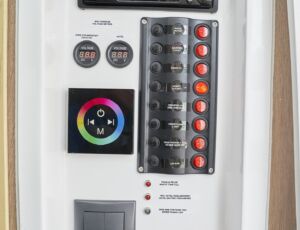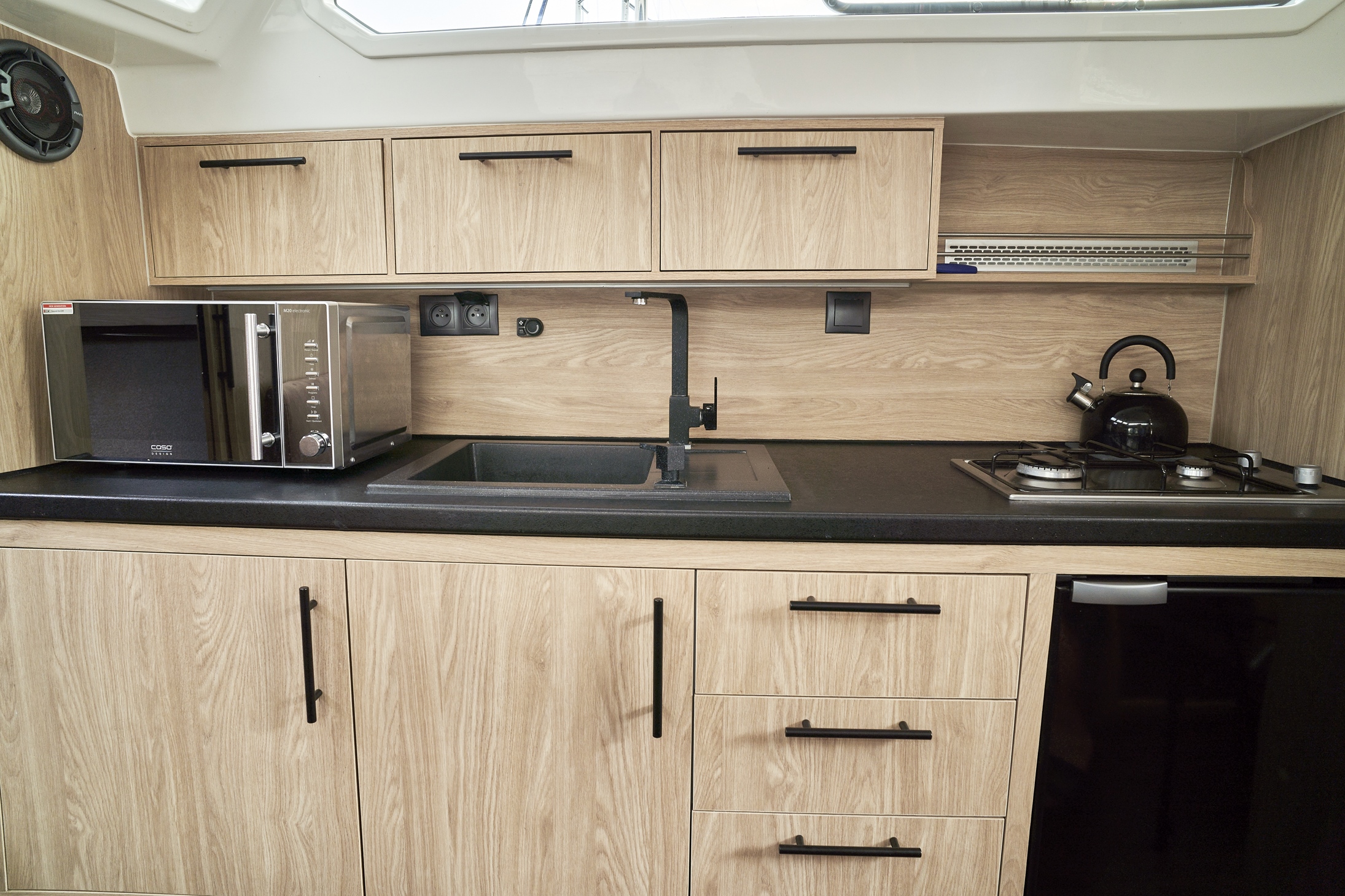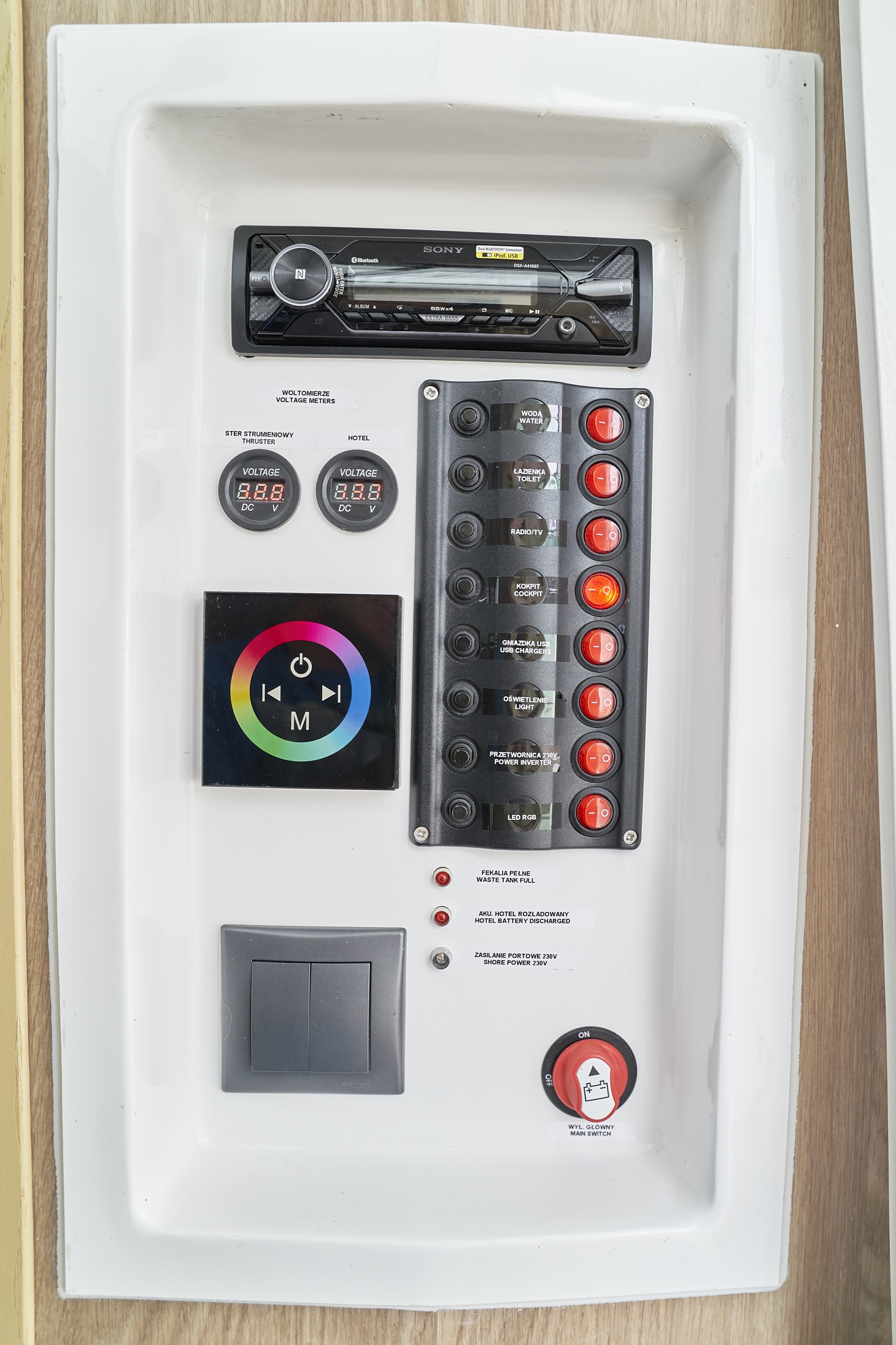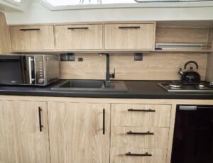- Przetwornica 230v – zasilana wszystkie gniazdka na jachcie w tym ekspres do kawy i kostkarka do lodu (z wyłączeniem kuchenki mikrofalowej)
