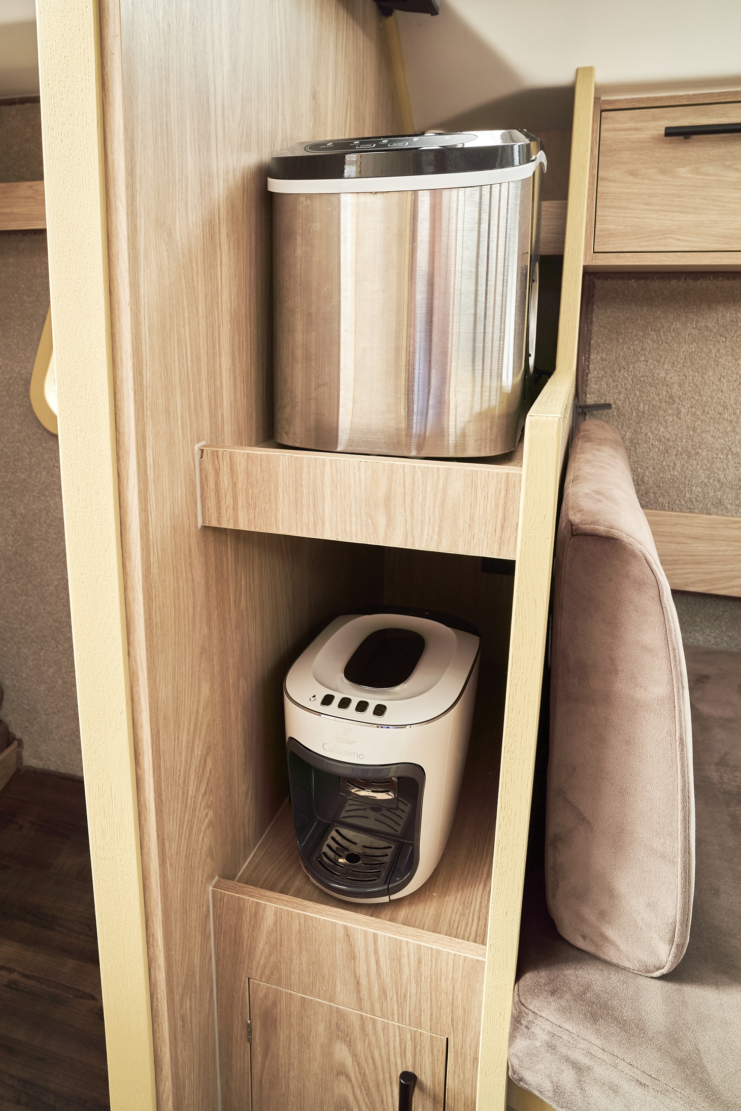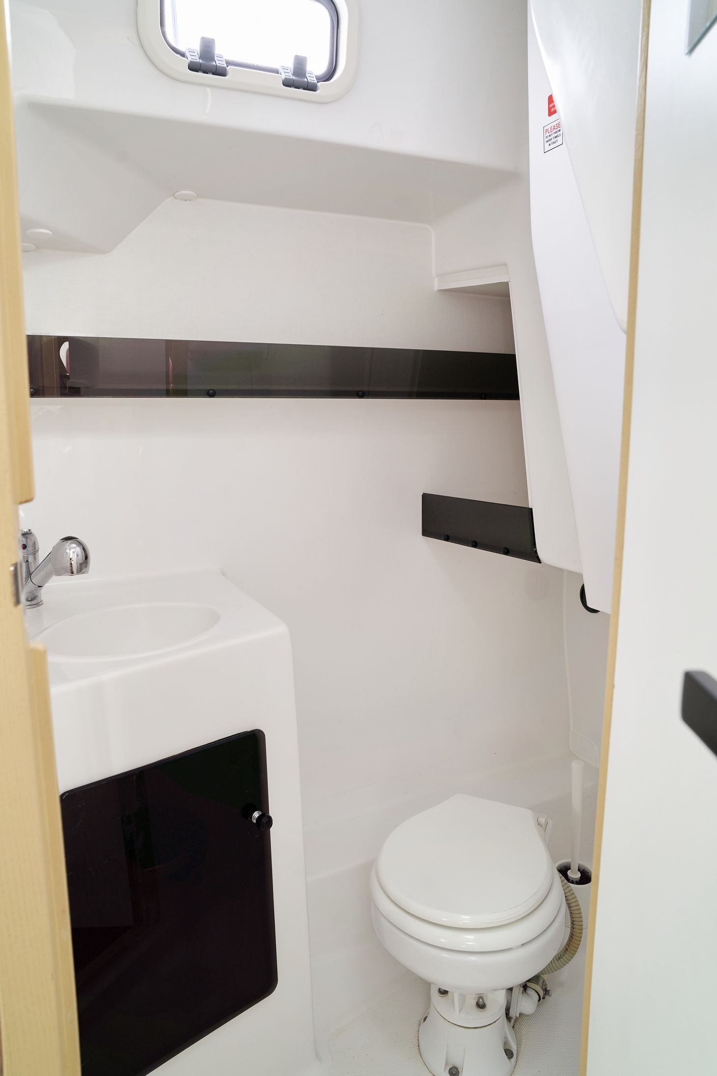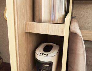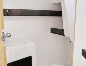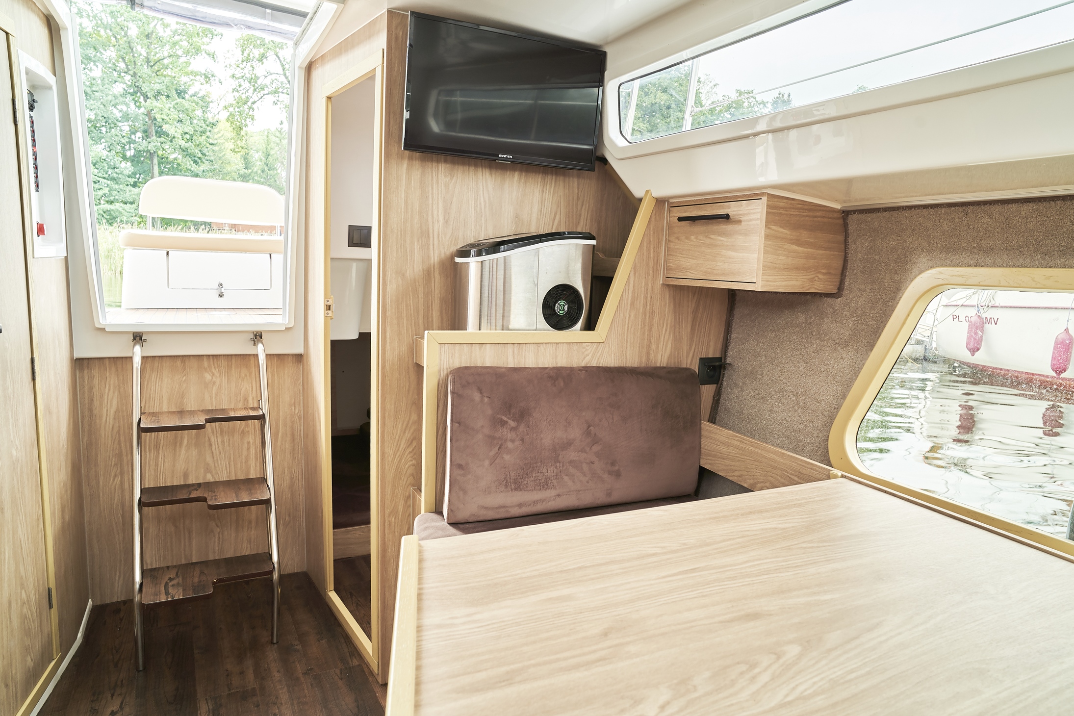 - Przetwornica 230v – zasilana wszystkie gniazdka na jachcie w tym ekspres do kawy i kostkarka do lodu (z wyłączeniem kuchenki mikrofalowej)
